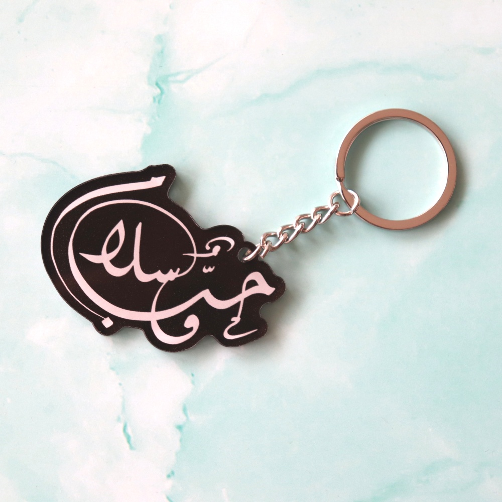 Porte clé avec très jolie calligraphie artistique de l'expression arabe "Hubbun wa salâm" حُبٌّ وَسَلاَم (Amour et paix).