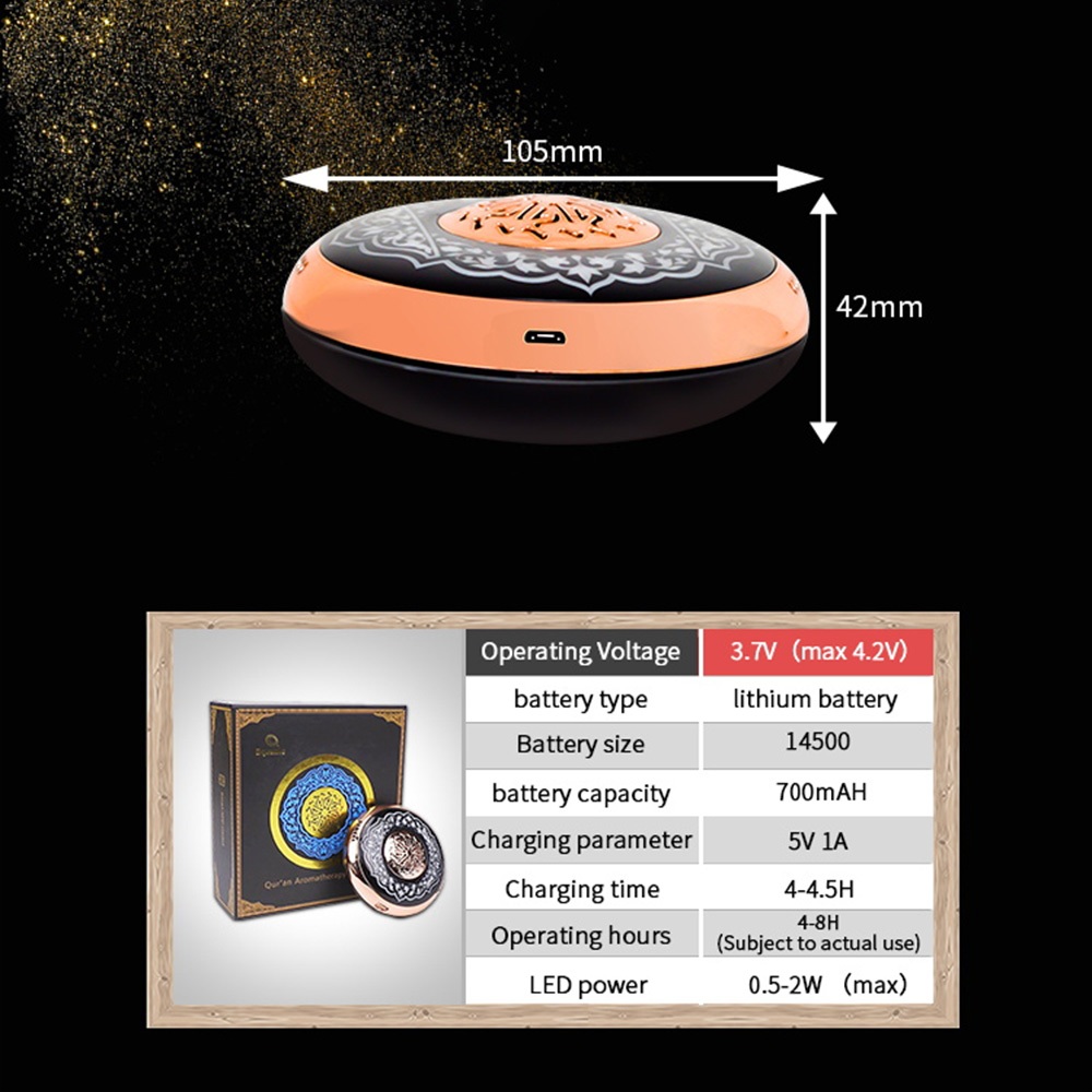Contient entre autres une traduction Audio du Coran, Traduction Verset par Verset, Traduction mot par mot, Explication Audio Complète, Radio FM, Lecteur Mp3, Selection Rapide De lecture du Coran et une Télécommande rechargeable.