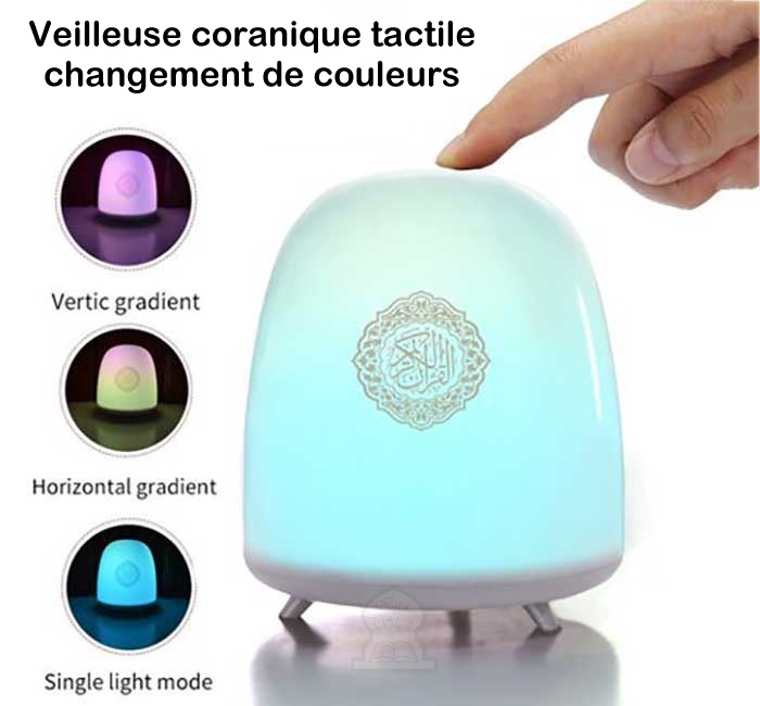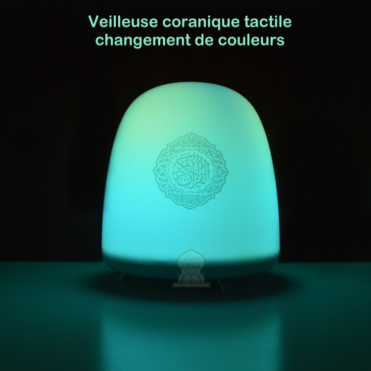 Veilleuse coranique tactile avec changement de couleurs. Télécommande - Cable USB. Le Saint Coran complet récité par 18 récitateurs différents - 14 traductions du Coran dont le français et l'anglais...