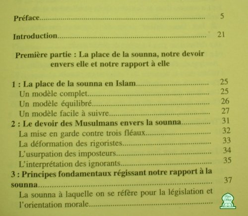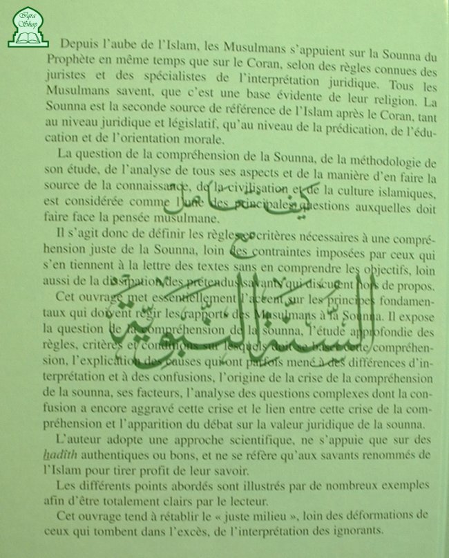 Cet ouvrage met essentiellement l'accent sur les principes fondamentaux qui doivent régir les rapports des Musulmans à la sounna. Il expose la question de la compréhension de celle çi, l'étude approfondie des règles, critères et conditions sur lesquels doit se baser cette compréhension, l'explication des causes qui ont parfois mené à des différences d'interprétation et à des confusions, l'origine de la crise de la compréhension de la sounna, ses facteurs, l'analyse des questions complexes dont la confusion a encore aggravé cette crise et le lien entre cette crise de la compréhension et l'apparation du débat sur la valeur juridique de la sounna.