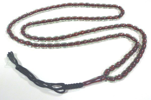 Chapelet grenat à 99 grains ovales transparents noir et rouge avec séparations tous les 33 grains.
