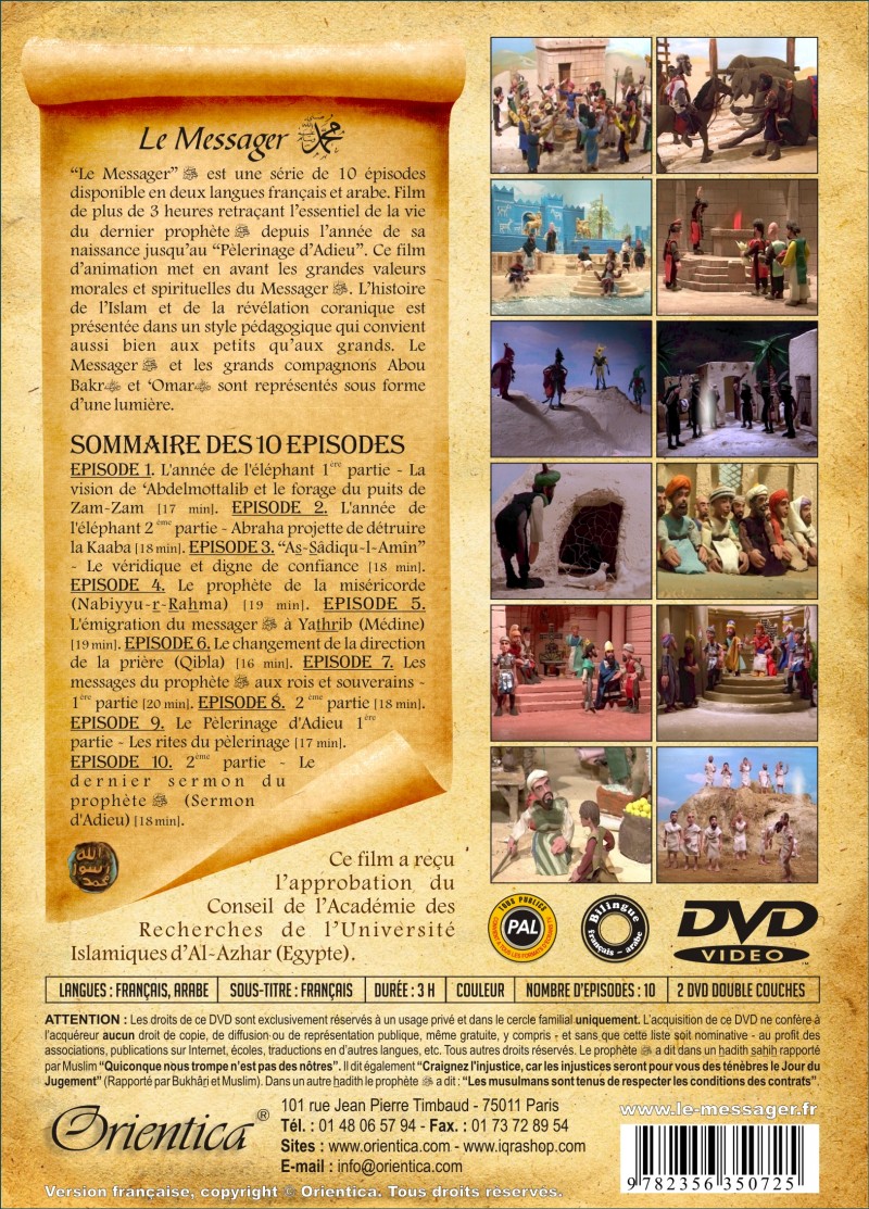 “Le Messager” (SAW) est une série de 10 épisodes disponible en deux langues français et arabe. Film de plus de 3 heures retraçant l’essentiel de la vie du dernier prophète (SAW) depuis l’année de sa naissance jusqu’au “Pèlerinage d’Adieu”. Ce film d’animation met en avant les grandes valeurs morales et spirituelles du Messager (SAW). L’histoire de l’Islam et de la révélation coranique est présentée dans un style pédagogique qui convient aussi bien aux petits qu’aux grands. Le Messager (SAW) et les grands compagnons Abou Bakr (RA) et ‘Omar (RA) sont représentés sous forme d’une lumière.