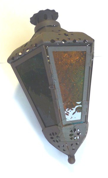 Lampe traditionnelle en fer forgé avec verres de plusieurs couleurs s'acroche comme un lustre.