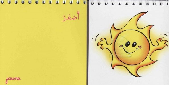 Imagier bilingue arabe - français à spirales découpé en cartes. Trouve la couleur du soleil, l'orange. Découvre ainsi les dix couleurs.