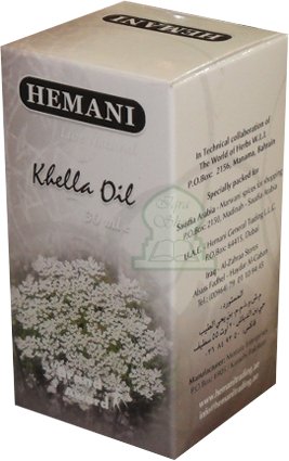 Huile de Khella "Ammi visnaga" (30 ml). Elle agit principalement au niveau respiratoire, cardio-vasculaire et digestif grâce à une application cutanée. Les effets secondaires sont peu importants mis à part la photosensibilisation.