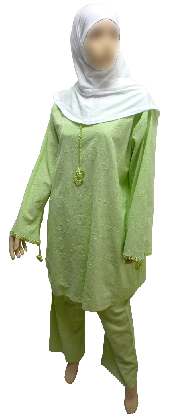 Ensemble "Ikram" couleur vert clair (tunique large et pantalon). Tissu agréable à mettre, motifs fleurs discrets. Le hidjab sur la photo n'est pas fourni. Composition : 65% coton 35% polyester.