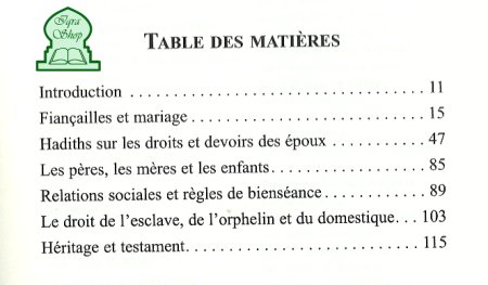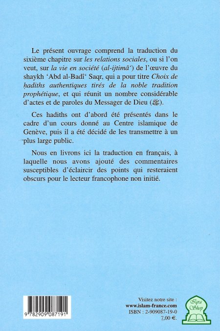 Le présent ouvrage comprend la traduction du sixième chapitre sur les relations sociales, ou si l'on veut, sur la vie en société (al-ijtimâ') de l'oeuvre du shaykh 'Abd al-Badi' Saqr, qui a pour titre Choix de hadiths authentiques tirés de la noble tradition prophétique, et qui réunit un nombre considérable d'actes et de paroles du Messager de Dieu (swt).