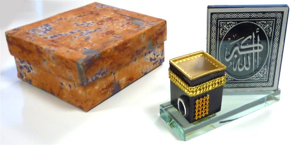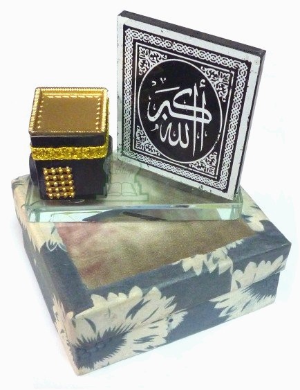Garniture Kaaba et inscriptions islamiques en verre avec sa boite cadeau.