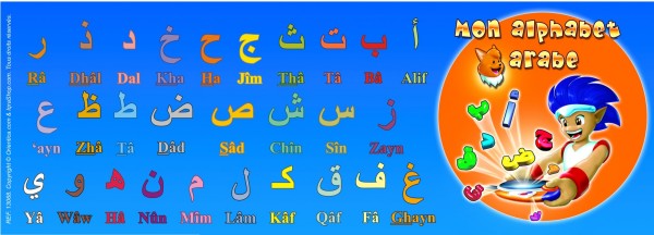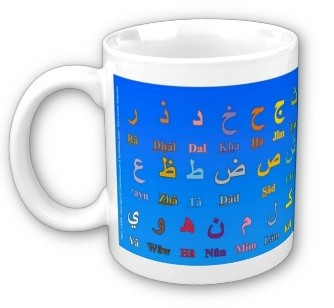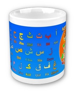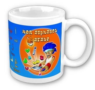 Mug mon alphabet arabe avec les 28 lettres de l'alphabet en arabe et écriture phonétique.