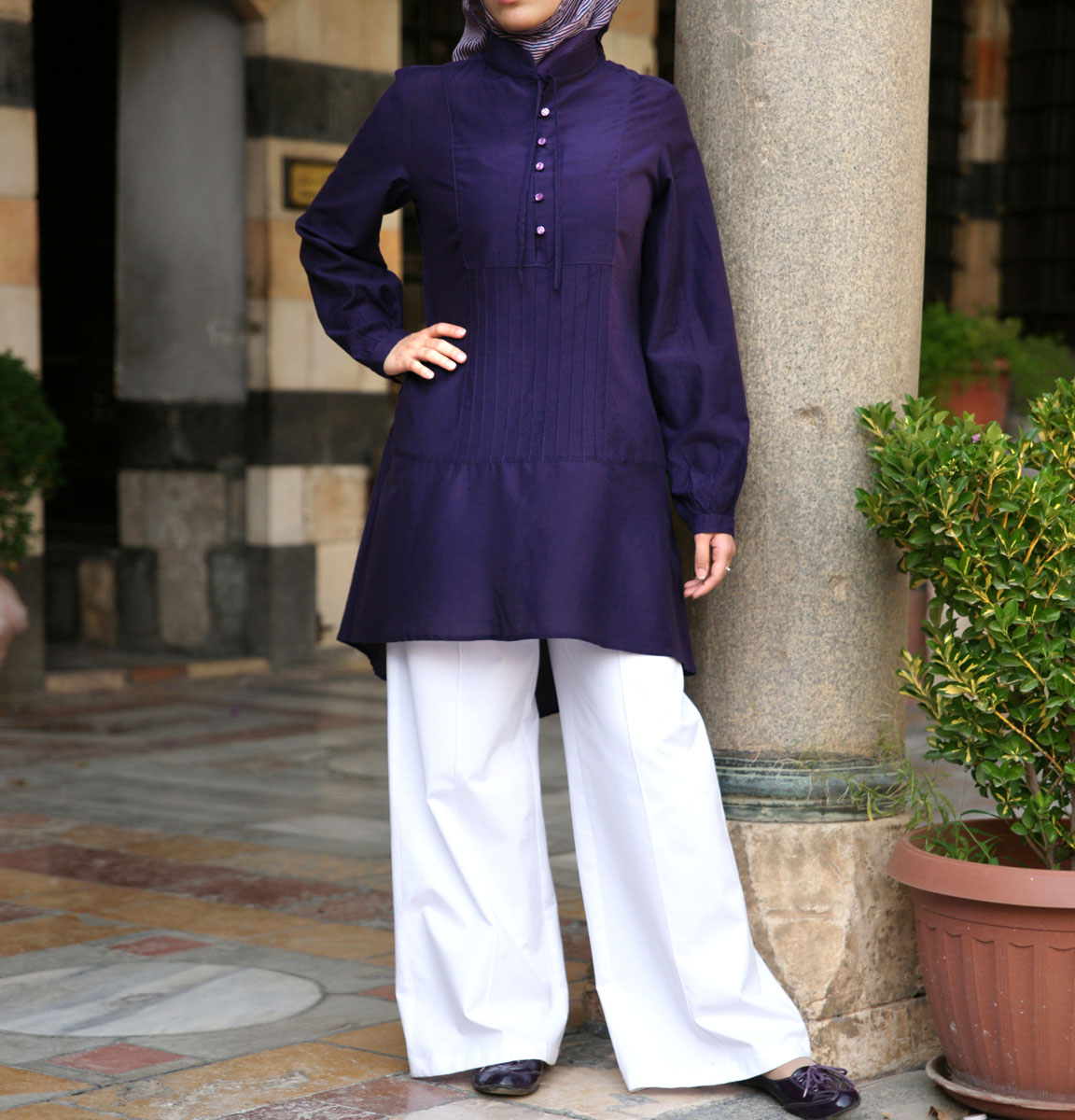 Description: mi-cuisse à l'avant et longueur au genou derrière; col mandarin ouvert ; poignets boutonnés;