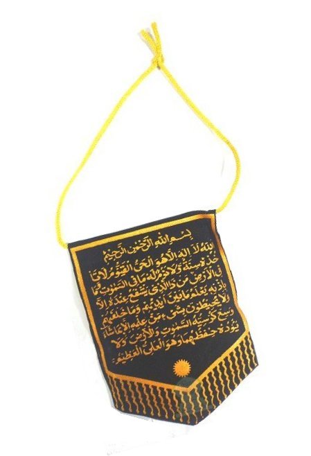 Pendentif avec inscription "Le Verset du Trône" (Ayat al-Kursi) sur une face et sur l'autre face l'invocation du voyage (ou du voyageur) dou'a assafar. Inscription dorée sur velours.