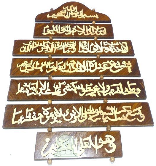 Tableau en bois constitué de plusieurs parties avec l'inscription en arabe du verset du Trône (Ayataoul Koursî).