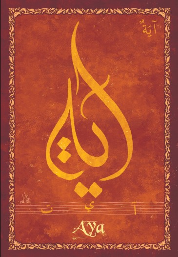 Jolie carte postale représentant le prénom arabe Aya calligraphié en arabe ainsi que son épellation lettre par lettre en arabe. Derrière la carte postale se trouve la signification du prénom.