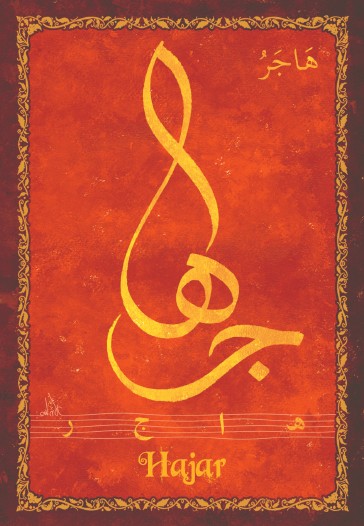 Jolie carte postale représentant le prénom arabe Hajar calligraphié en arabe ainsi que son épellation lettre par lettre en arabe. Derrière la carte postale se trouve la signification du prénom. Prénom d'origine arabe signifiant foi émigrer vers Allah.