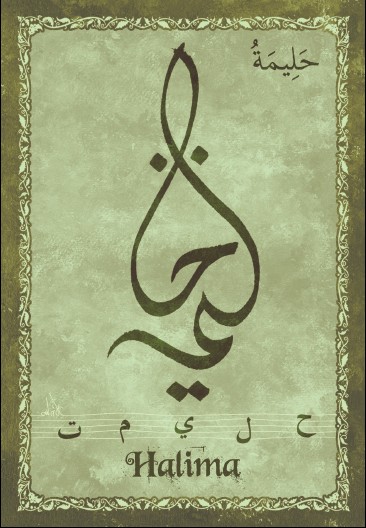 Jolie carte postale représentant le prénom arabe Halima calligraphié en arabe ainsi que son épellation lettre par lettre en arabe. Derrière la carte postale se trouve la signification du prénom. Prénom d'origine arabe signifiant indulgente, clémente.