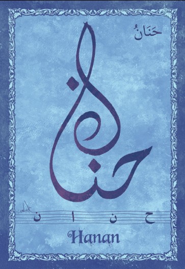Jolie carte postale représentant le prénom arabe Hanan calligraphié en arabe ainsi que son épellation lettre par lettre en arabe. Derrière la carte postale se trouve la signification du prénom. Prénom d'origine arabe signifiant tendresse, compassion.