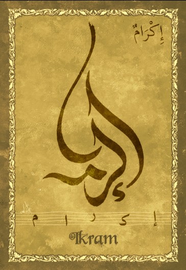 Jolie carte postale représentant le prénom arabe Ikram calligraphié en arabe ainsi que son épellation lettre par lettre en arabe. Derrière la carte postale se trouve la signification du prénom. Prénom d'origine arabe signifiant estime, vénération.
