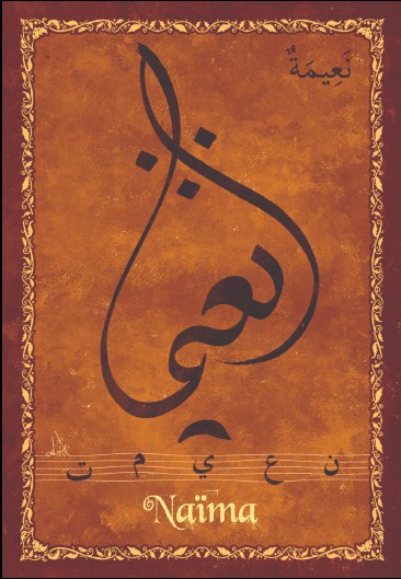 Jolie carte postale représentant le prénom arabe Naima calligraphié en arabe ainsi que son épellation lettre par lettre en arabe. Derrière la carte postale se trouve la signification du prénom.
