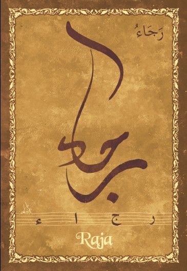 Jolie carte postale représentant le prénom arabe Raja calligraphié en arabe ainsi que son épellation lettre par lettre en arabe. Derrière la carte postale se trouve la signification du prénom: Prénom d'origine arabe signifiant espérance.
