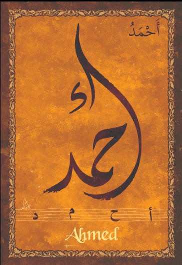 Jolie carte postale représentant le prénom arabe Ahmed calligraphié en arabe ainsi que son épellation lettre par lettre en arabe. Derrière la carte postale se trouve la signification du prénom. Prénom d'origine arabe signifiant le plus loué.