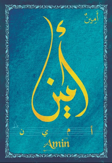 Jolie carte postale représentant le prénom arabe Amin calligraphié en arabe ainsi que son épellation lettre par lettre en arabe. Derrière la carte postale se trouve la signification du prénom.