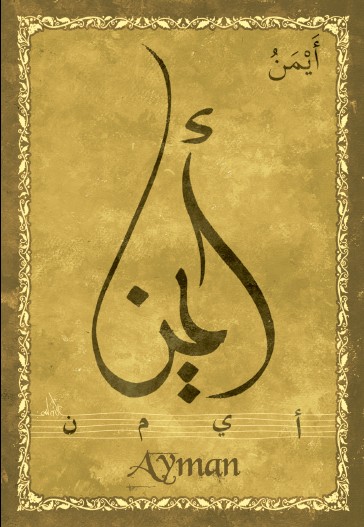 Jolie carte postale représentant le prénom arabe Ayman calligraphié en arabe ainsi que son épellation lettre par lettre en arabe. Derrière la carte postale se trouve la signification du prénom.