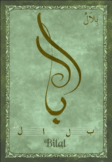 Jolie carte postale représentant le prénom arabe Bilal calligraphié en arabe ainsi que son épellation lettre par lettre en arabe. Derrière la carte postale se trouve la signification du prénom.