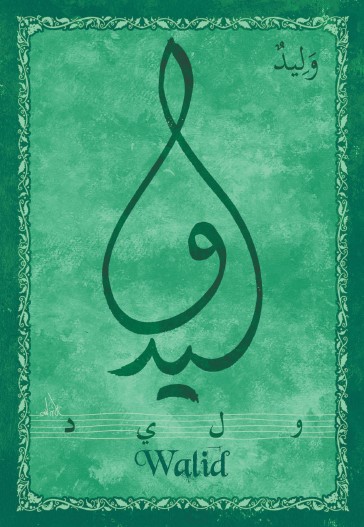 Jolie carte postale représentant le prénom arabe Walid calligraphié en arabe ainsi que son épellation lettre par lettre en arabe. Derrière la carte postale se trouve la signification du prénom.