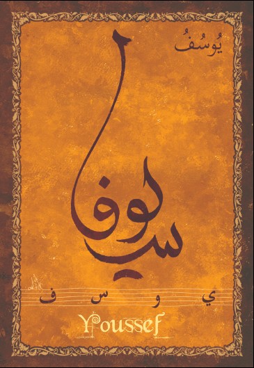 Jolie carte postale représentant le prénom arabe Youssef calligraphié en arabe ainsi que son épellation lettre par lettre en arabe. Derrière la carte postale se trouve la signification du prénom. Prénom d'origine arabe signifiant beauté sublime.