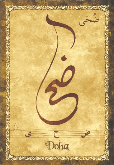 Jolie carte postale représentant le prénom arabe Doha calligraphié en arabe ainsi que son épellation lettre par lettre en arabe. Derrière la carte postale se trouve la signification du prénom. Prénom d'origine arabe signifiant matinée, clarté.