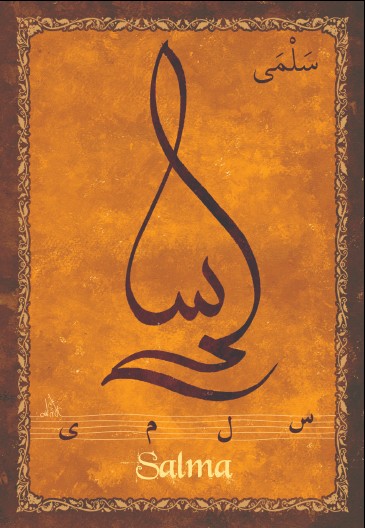 Jolie carte postale représentant le prénom arabe Selma calligraphié en arabe ainsi que son épellation lettre par lettre en arabe. Derrière la carte postale se trouve la signification du prénom. Prénom d'origine arabe signifiant saine, intacte, pacifique.