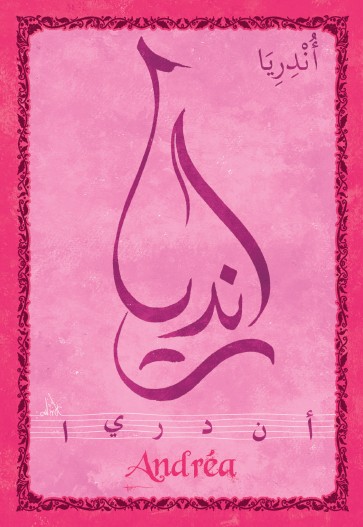 Jolie carte postale représentant le prénom français Andréa calligraphié en arabe ainsi que son épellation lettre par lettre en arabe. Derrière la carte postale se trouve la signification du prénom. Prénom d'origine grec signifiant illustre.