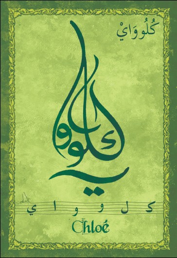 Jolie carte postale représentant le prénom français Chloé calligraphié en arabe ainsi que son épellation lettre par lettre en arabe. Derrière la carte postale se trouve la signification du prénom. Prénom d'origine grec signifiant jeune arbre.