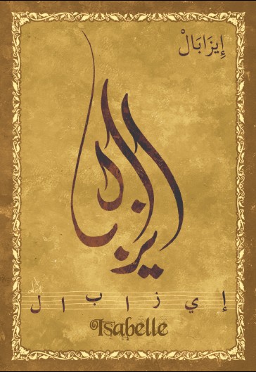 Jolie carte postale représentant le prénom français Isabelle calligraphié en arabe ainsi que son épellation lettre par lettre en arabe. Derrière la carte postale se trouve la signification du prénom. Prénom d'origine hébreu signifiant Dieu est plénitude.