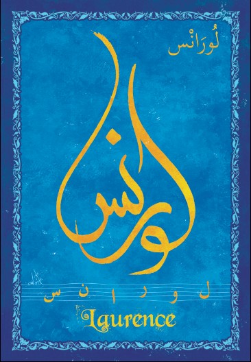 Jolie carte postale représentant le prénom français Laurence calligraphié en arabe ainsi que son épellation lettre par lettre en arabe. Derrière la carte postale se trouve la signification du prénom. Prénom d'origine latine signifiant le laurier.
