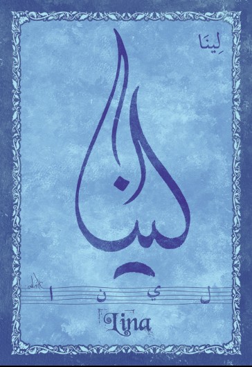 Jolie carte postale représentant le prénom français Lina calligraphié en arabe ainsi que son épellation lettre par lettre en arabe. Derrière la carte postale se trouve la signification du prénom. Prénom ayant deux origine, une d'origine arabe signifiant souplesse,douceur. L'autre d'origine germanique signifiant noble.