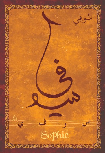Jolie carte postale représentant le prénom français Sophie calligraphié en arabe ainsi que son épellation lettre par lettre en arabe. Derrière la carte postale se trouve la signification du prénom. Prénom d'origine grec signifiant sagesse.