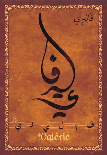 Jolie carte postale représentant le prénom français Valérie calligraphié en arabe ainsi que son épellation lettre par lettre en arabe. Derrière la carte postale se trouve la signification du prénom. Prénom d'origine latin signifiant valeureuse.