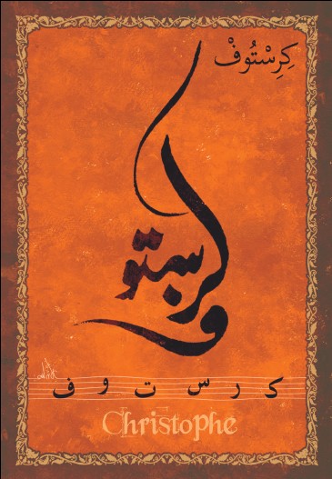 Jolie carte postale représentant le prénom français Christophe calligraphié en arabe ainsi que son épellation lettre par lettre en arabe. Derrière la carte postale se trouve la signification du prénom. Prénom d'origine grec signifiant qui porte le Christ.