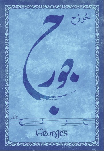 Jolie carte postale représentant le prénom français Georges calligraphié en arabe ainsi que son épellation lettre par lettre en arabe. Derrière la carte postale se trouve la signification du prénom. Prénom d'origine grec signifiant qui travaille la terre.