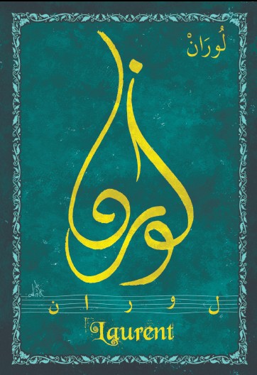 Jolie carte postale représentant le prénom français Laurent calligraphié en arabe ainsi que son épellation lettre par lettre en arabe. Derrière la carte postale se trouve la signification du prénom. Prénom d'origine latine signifiant le laurier.