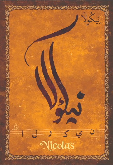 Jolie carte postale représentant le prénom français Nicolas calligraphié en arabe ainsi que son épellation lettre par lettre en arabe. Derrière la carte postale se trouve la signification du prénom. Prénom d'origine grec signifiant victoire du peuple.