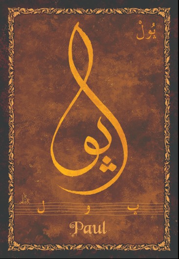 Jolie carte postale représentant le prénom français Paul calligraphié en arabe ainsi que son épellation lettre par lettre en arabe. Derrière la carte postale se trouve la signification du prénom.