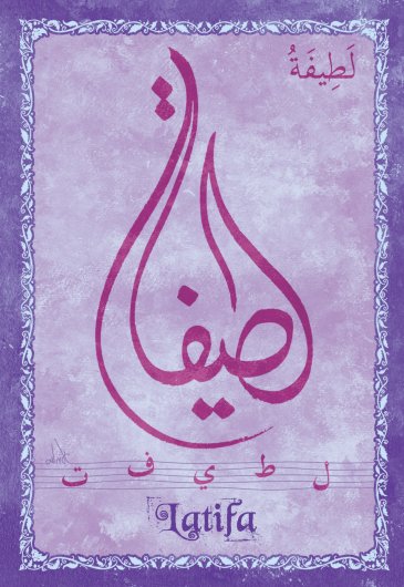 Jolie carte postale représentant le prénom arabe "Latifa" calligraphié en arabe ainsi que son épellation lettre par lettre en arabe. Derrière la carte postale se trouve la signification du prénom.