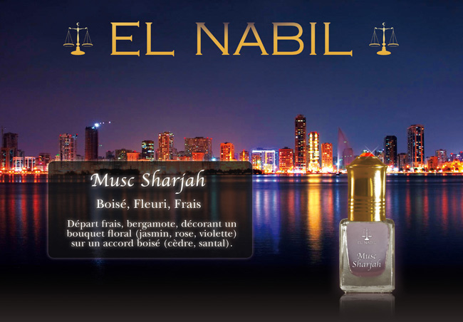 Parfum El Nabil "Musc Sharjah" : Boisé, fleuri, frais... Départ frais, bergamote, décorant un bouquet floral (jasmin, rose, violette) sur un accord boisé (cèdre, santal).