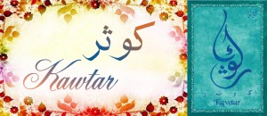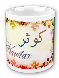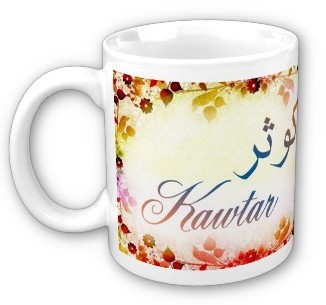 Mug avec le prénom Kawtar (Kawthar) calligraphié en arabe (كوثر) ainsi que son épellation lettre par lettre en arabe.