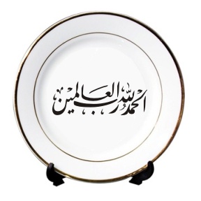 Assiette en porcelaine avec calligraphie artistique du 1er verset coranique de Sourate Al-Fâtiha : "Louange à Allah Seigneur des mondes" (الحمد لله رب العالمين). Calligraphie réalisée par un calligraphe professionnel. Cette assiette se mariera bien avec tous types de mobiliers.