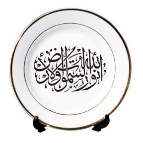 Assiette en porcelaine avec calligraphie artistique du verset coranique "Allah est la Lumière des cieux et de la terre" { الله نُورُ السَّمَـوَاتِ وَالأرْضِ } (Allahou Nourou-s-samâwâti wa l-ard ) [Sourate An-Nour].