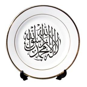 Assiette en porcelaine avec calligraphie artistique de l'attestation de foi musulmane : "Il n'y a pas d'autre divinité qu'Allah et Mohamed est son prophète." لا إله إلا الله محمد رسول الله