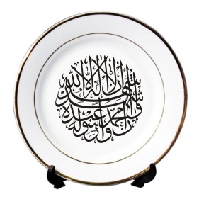 Assiette en porcelaine avec calligraphie artistique de l'attestation de foi musulmane : "J'atteste qu'Il n'y a pas d'autre divinité qu'Allah et j'atteste que Mohammed est Son serviteur est Son messager." أشهد أن لآ إلَهَ اِلا الله وأشهد أن محمدا عبده ورسوله